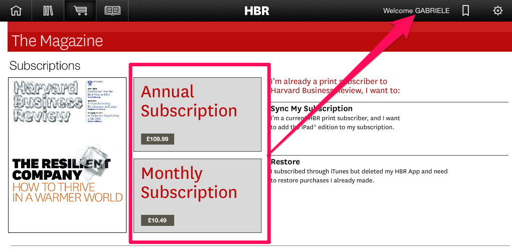 Wait: I’ve already paid, I’ve already registered my subscription and I’m logged in! Why can’t this whole area where the app asks me to either buy a subscription or sync it with my subscription bought through hbr.org just disappear? No idea…